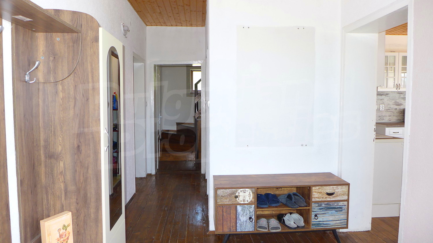 В цокольном этаже расположена, кухня и гостиная. Внутренняя лестница ведет на первом этаже где находятся три спальни, две ванные комнаты, и две небольших складских помещений.
