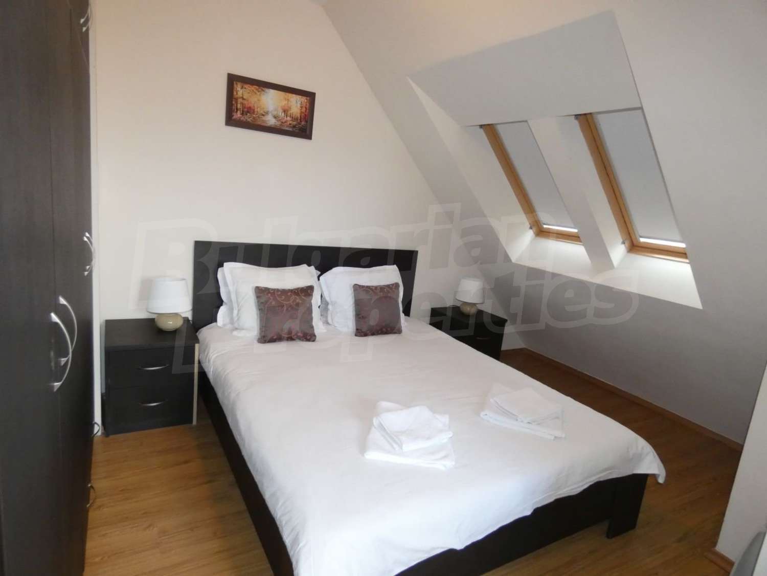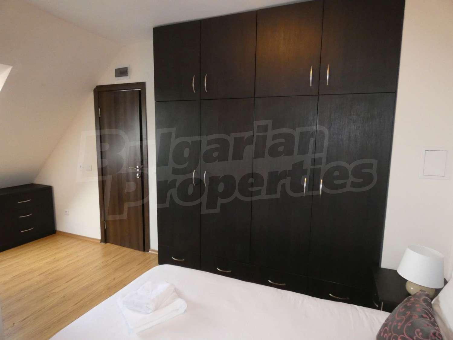 • СПАЛЬНЯ 1: двуспальная кровать,2 ночных шкафчика с ночными лампами, шкаф для одежды