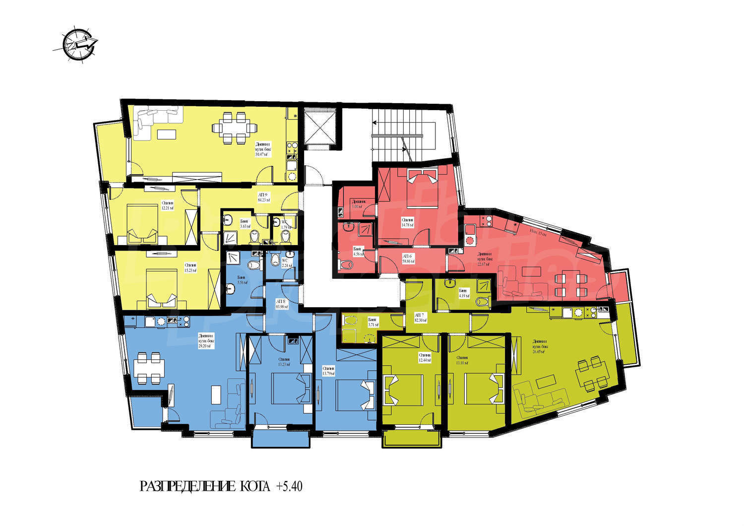 79.81 м2 (жилая площадь: 67.45 м2 плюс общие части: 12.36 м2) еще
