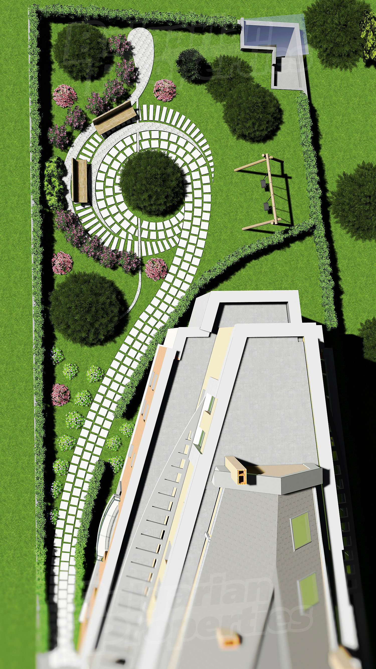 Здание должно быть закрытого типа и, следовательно, будет иметь контроль доступа, ограждение и видеонаблюдение со всех сторон, чтобы предотвратить доступ посторонних лиц и обеспечить необходимый комфорт. Предусмотрен ландшафтный дизайн по проекту с детскими аттракционами, перголами, скамейками и местами для отдыха.