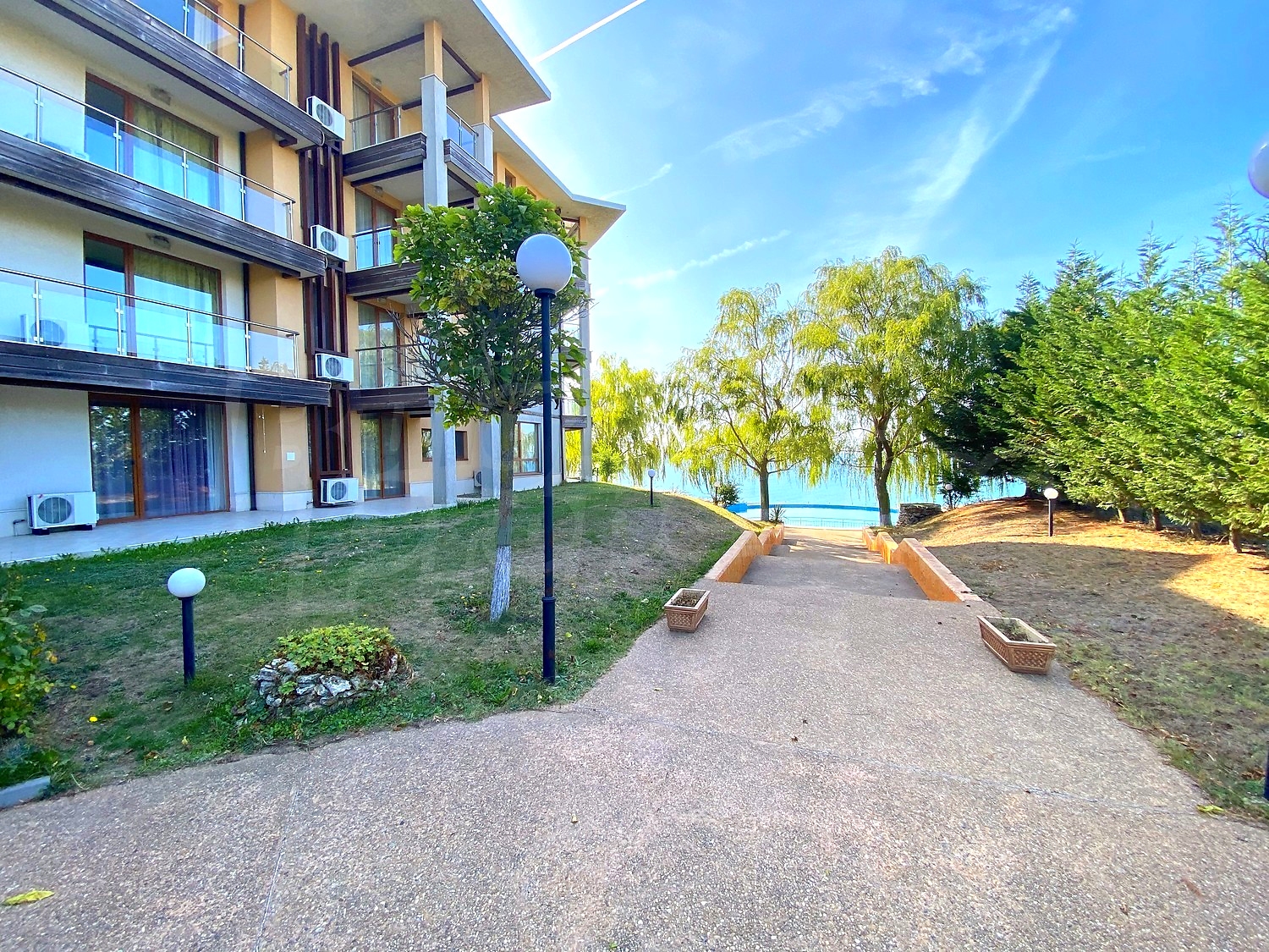 До пляжа можно дойти по лестинце, которая расположена у подножия скалы, на вершине которой находится комплекс.