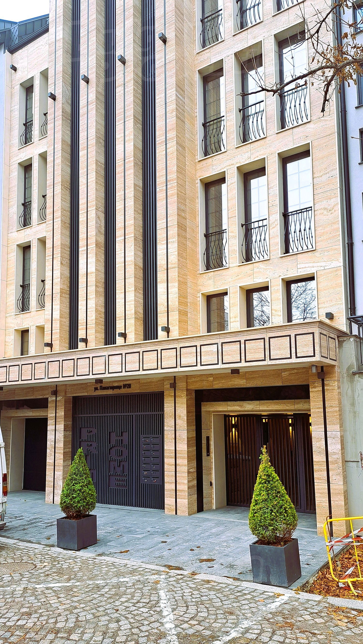 Удачно воплощает в своем дизайне классическую архитектуру и современный стиль. Расположенное между двумя набережными, пятиэтажное здание с двумя мансардными и одним подземным этажами. В нем тринадцать квартир с разнообразными планировками. На подземном этаже расположены кладовые, пять парковочных мест и две гаражные ячейки, а на первом этаже - три гаражные ячейки и три наземных парковочных места. Вертикальные коммуникации состоят из лифта и лестницы, обслуживающей все уровни. В оформлении главных фасадов здания использованы высококачественные материалы - разнофактурные травертиновые плиты и кованые перила с естественной патиной.