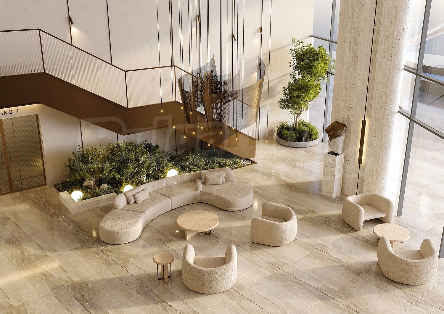 - Общий первый этаж, включающий в себя подземную парковку и частные зоны отдыха с доступом, независимым от жилой зоны. Здесь расположены детский центр, выставочные залы, салон красоты и магазин. Просторный вестибюль с контролируемым доступом обеспечивает комфорт и безопасность, а отдельные входы в общественные зоны сохраняют четкое функциональное разделение. Этот уровень спроектирован как активная общественная зона и естественное продолжение городской среды.