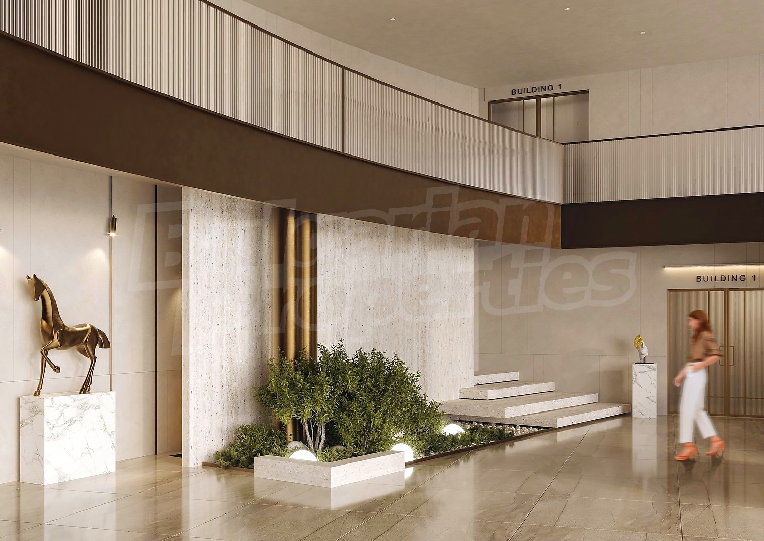 - Общий первый этаж, включающий в себя подземную парковку и частные зоны отдыха с доступом, независимым от жилой зоны. Здесь расположены детский центр, выставочные залы, салон красоты и магазин. Просторный вестибюль с контролируемым доступом обеспечивает комфорт и безопасность, а отдельные входы в общественные зоны сохраняют четкое функциональное разделение. Этот уровень спроектирован как активная общественная зона и естественное продолжение городской среды.