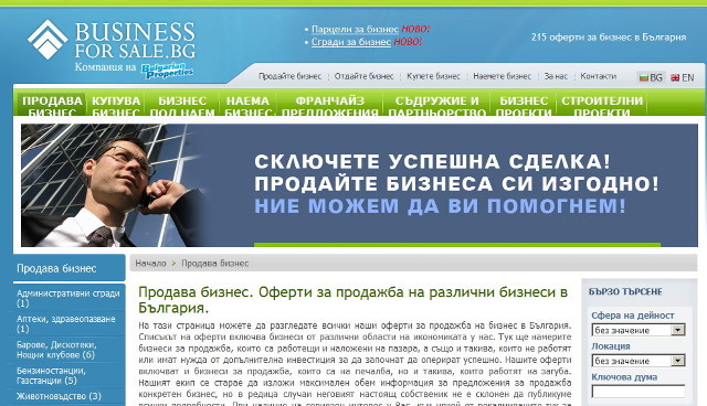 За последний год мы отметили рост количества запросов наших клиентов, которые ищут решения при продаже своего готового бизнеса или части него. Множество факторов оказывают влияние на собственников компаний, во время принятия решения о продаже своего бизнеса. Наше желание помочь своим клиентам, которое руководит нами и при продаже недвижимости, навело нас идею создания нашей самой молодой дочерней структуры BusinessForSale.BG. По существу это консультантская организация, которая занимается посредничеством в процессе купли-продажи и маркетинга компаний, бизнесов, предприятий, брэндов, патентов, лицензий, франчайзи и др.
