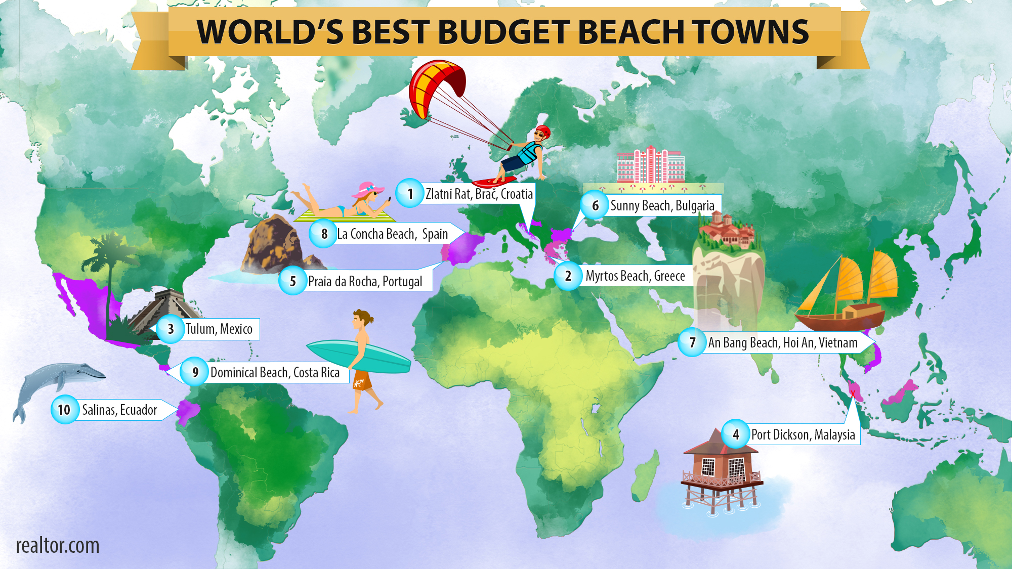 Другие, наиболее доступные пляжные города, популярные для покупки второго дома: Zlatni Rat (Хорватия), Myrtos Beach (Греция), Tulum (Мексика), Port Dickson (Малайзия), Praia da Rocha (Португалия), Bang Beach (Вьетнам), La Concha Beach (Коста Рика) и Salinas (Эквадор).