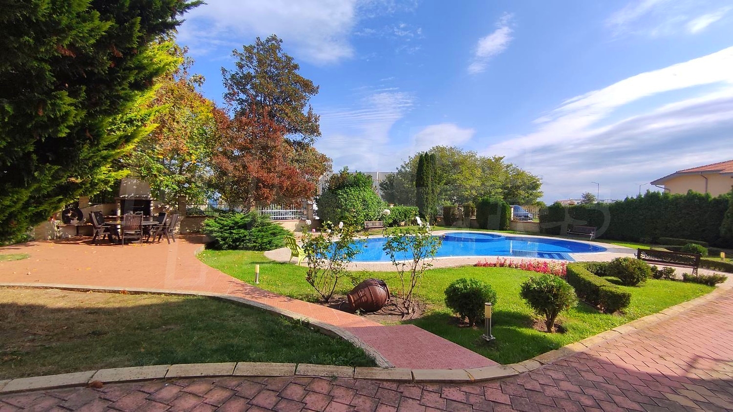На территории комплекса расположены бассейны, зоны барбекю общего пользования и детская площадка, что делает объект подходящим как для семейного отдыха, так и для сдачи в аренду.